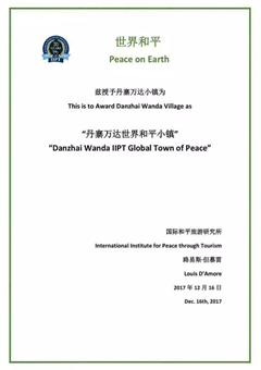 在“丹寨与世界的对话”活动中,世界和平旅游研究院的创始人兼主席路易斯亲自为丹寨万达小镇授予“世界和平小镇”证书。丹寨万达小镇代表当天还与美国南达科达州枯木城国家历史地标区的代表,共同签署了建立姊妹城区的协议备忘录。
